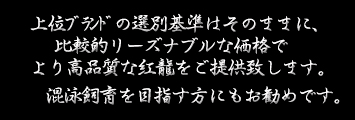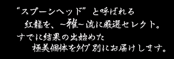 10万円前後の個体でありながら、 しっかりと安心して飼育できるレベルの紅龍をご紹介致します。 〜各ファーム個体をスポット入荷致します。〜 |