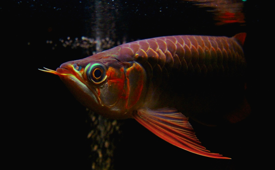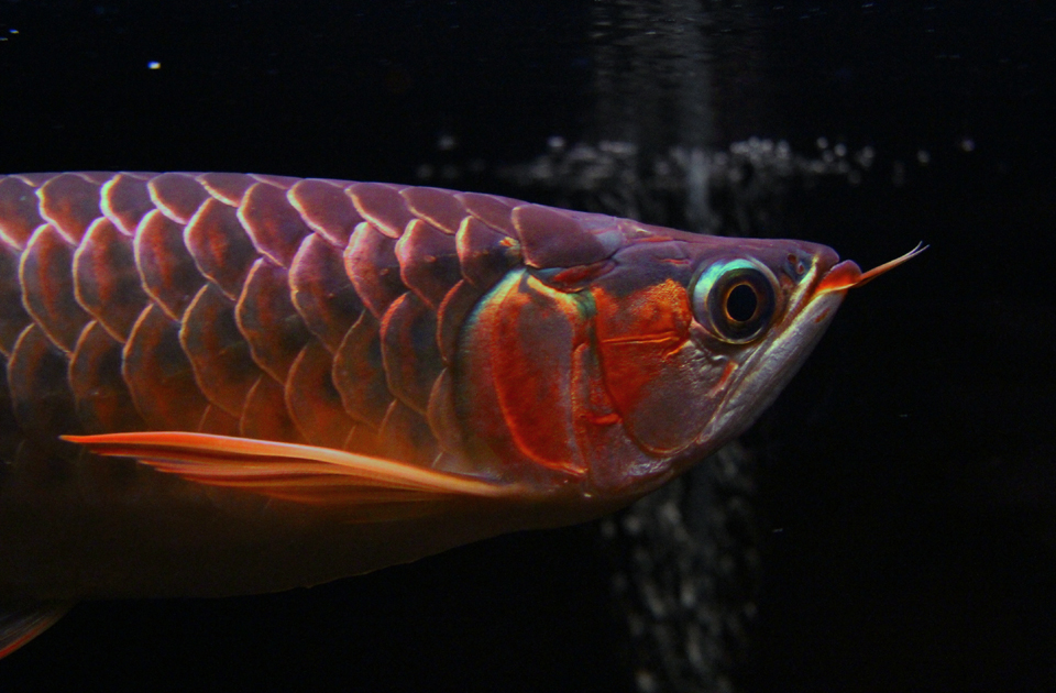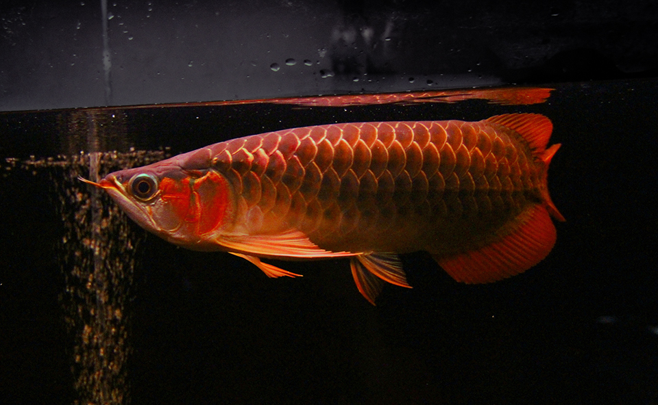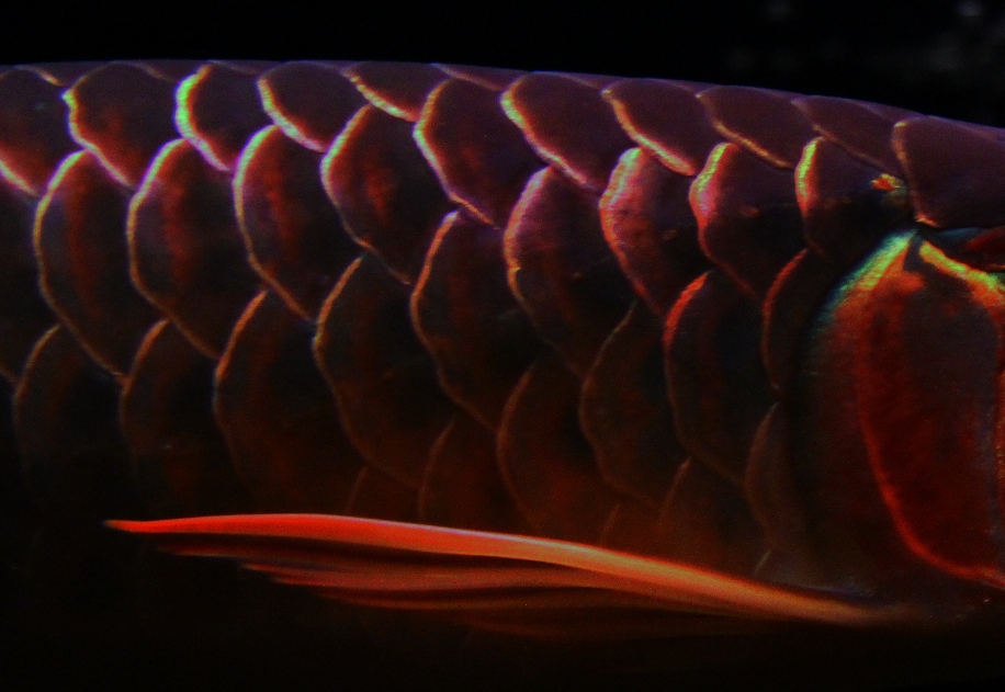 ![]() 照明を暗めにして撮影してみました。 上部ライト点灯で、実際に肉眼で見ると、鱗底は黒に近いこげ茶色で、くっきりと線を引いたように第一鱗かくが光っています。 その様子はほんとにクモの巣の模様のように見えるのですが、この部分は現在光っているだけで、まだ一次発色のオレンジは出ていません。 この細かくな光沢は、くっきりと尾びれ付近の細かい鱗にまで広がっていて、 ここに本格的な発色がのってくると考えると非常に楽しみですね。 |
